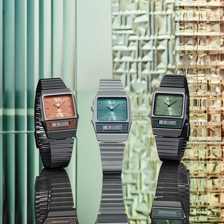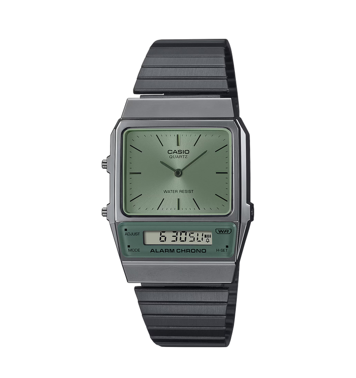 ساعت مچی اسپرت کاسیو مدل CASIO AQ-800ECGG-3ADF با صفحه آنالوگ و LCD جدا از هم، زیبایی آنالوگ را در کنار عملکرد دیجیتال به نمایش میگذارند، در حالی که زاویه ملایم بالای LCD شکلی مدرن به طراحی داده است که اشارهای به سبک دهه 80 دارد.