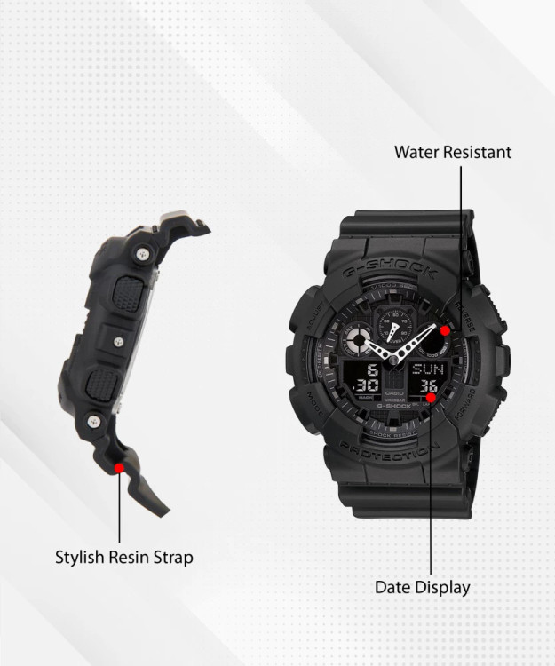 طراحی راحت و بند قابل تنظیم از دیگر مزیتهای این ساعت است. با ترکیب استایل و عملکرد، ساعت کاسیو G-SHOCK مدل GA-100-1A1 یک گزینه مناسب برای فردی است که به دنبال یک ساعت مدرن و قوی برای ماجراجوییهای روزمره و ورزشی میباشد.