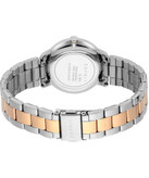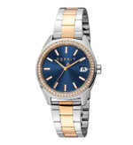 حاشیه صفحه ساعت مچی زنانه اسپریت | مدل ES1L347M0125، با استفاده از نگین های اورجینال مخراج کاری شده مزین شده است. صفحه ساعت رنگ سرمه ای فوق العاده جذابی دارد که ظاهر ساعت را کاملا متفاوت کرده است. قاب و بند ساعت نیز ترکیب دو رنگ رزگلد و نقره ای می باشد.