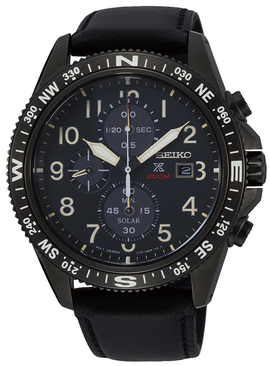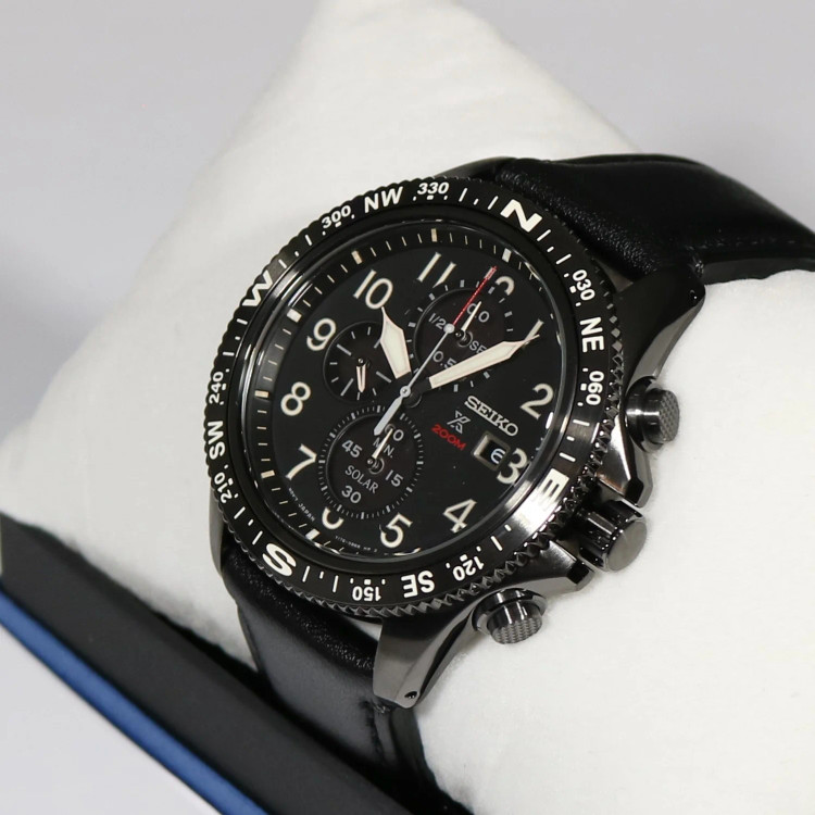 این طرح از برند ساعت سیکو با طراحی و رنگ خاص خود برای تیپهای نسبتا اسپرت بسیار مناسب میباشد. بدنه ی این ساعت سیکو از جنس استیل و بند آن چرمی است که از رنگ مشکی در آن استفاده شده است. از ویژگیهای منحصر به فرد این ساعت میتوان به طراحی بسیار شیک و اسپرت ساعت در عین مجلسی بودنش اشاره کرد. این ساعت سیکو کرنوگراف بوده که دقت کرتومتر آن 1/20 ثانیه میباشد. همچنین این ساعت سولار بوده و دارای باطری خود شارژ هست. از ویژگی های منحصر به فرد آن میتوان به قاب ساعت که مجهز به زه چرخان میباشد اشاره کرد که جهت های جغرافیایی را مشخص میکند. این ساعت دارای عقربه های شب نما و مقاوت در برابر آب تا عمق 200 متری میباشد.