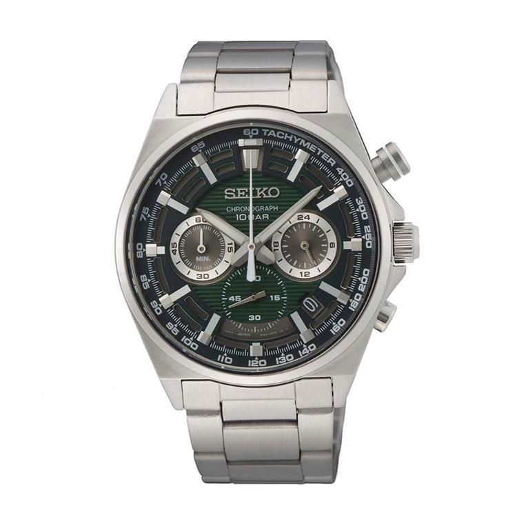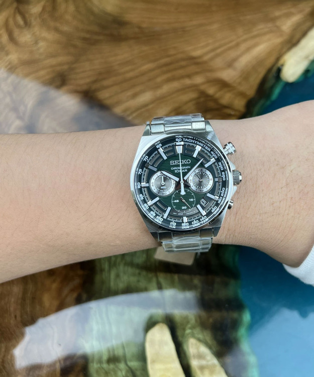 صفحه ساعت به رنگ سبز تیره طراحی شده و نشانگرهای نقرهای همراه با عقربههای پوشیدهشده با LumiBrite، خوانایی بالا حتی در شرایط کمنور را تضمین میکند. سه زیرصفحه تعبیه شده برای نمایش ثانیه، زمان 24 ساعته و کرنوگراف علاوه بر افزایش کارایی، جلوهای اسپرت و حرفهای به طراحی ساعت بخشیده است. موقعیت ساعت 4 نیز شامل نمایش تاریخ است که دسترسی به این اطلاعات را آسان میکند.