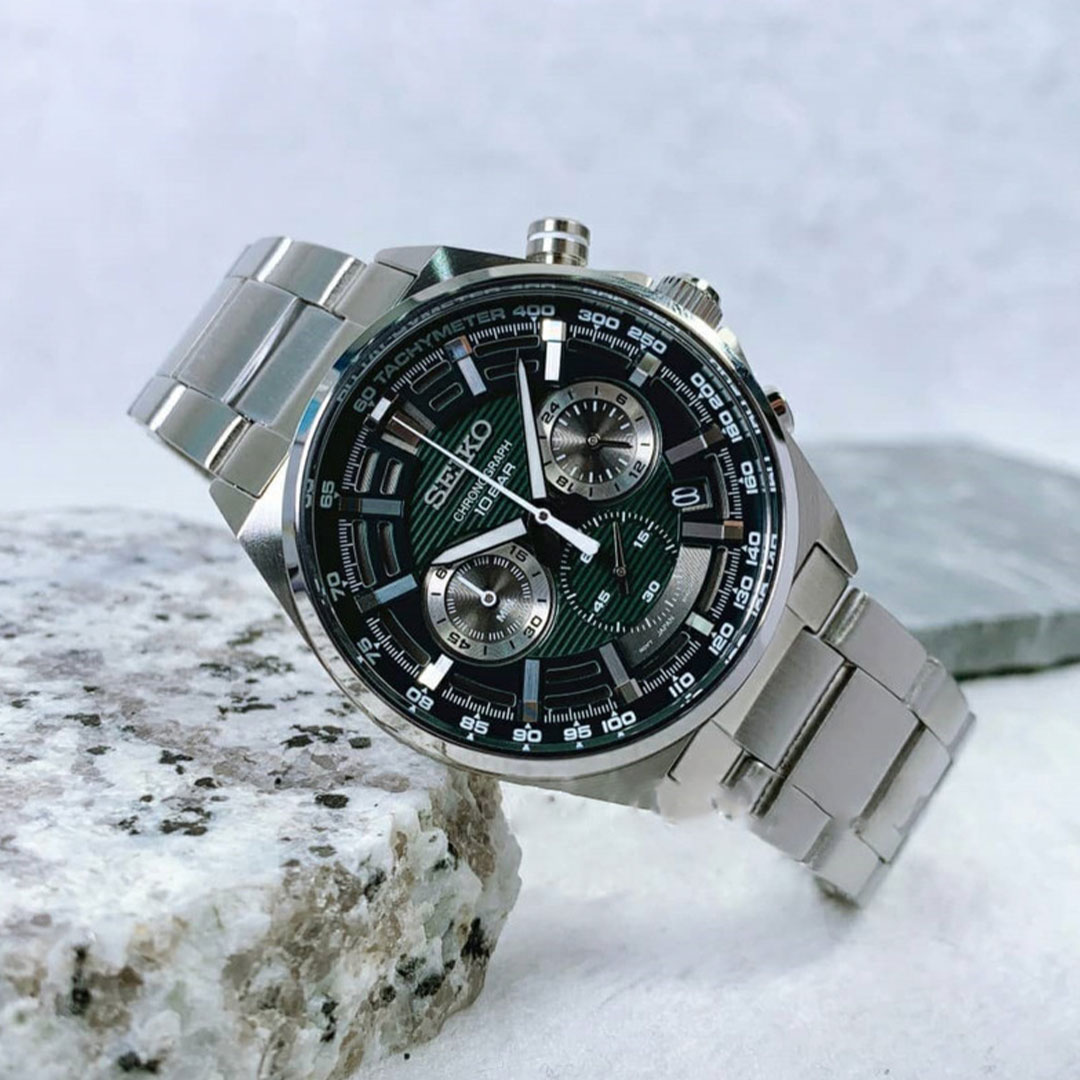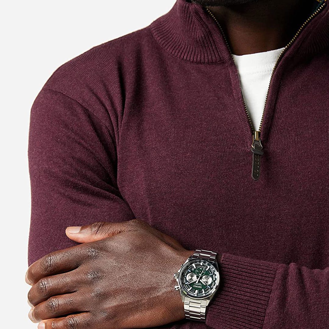 صفحه ساعت به رنگ سبز تیره طراحی شده و نشانگرهای نقرهای همراه با عقربههای پوشیدهشده با LumiBrite، خوانایی بالا حتی در شرایط کمنور را تضمین میکند. سه زیرصفحه تعبیه شده برای نمایش ثانیه، زمان 24 ساعته و کرنوگراف علاوه بر افزایش کارایی، جلوهای اسپرت و حرفهای به طراحی ساعت بخشیده است. موقعیت ساعت 4 نیز شامل نمایش تاریخ است که دسترسی به این اطلاعات را آسان میکند.