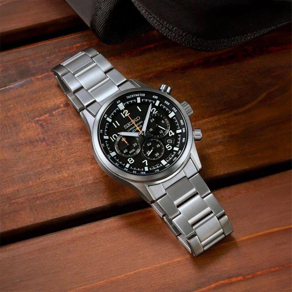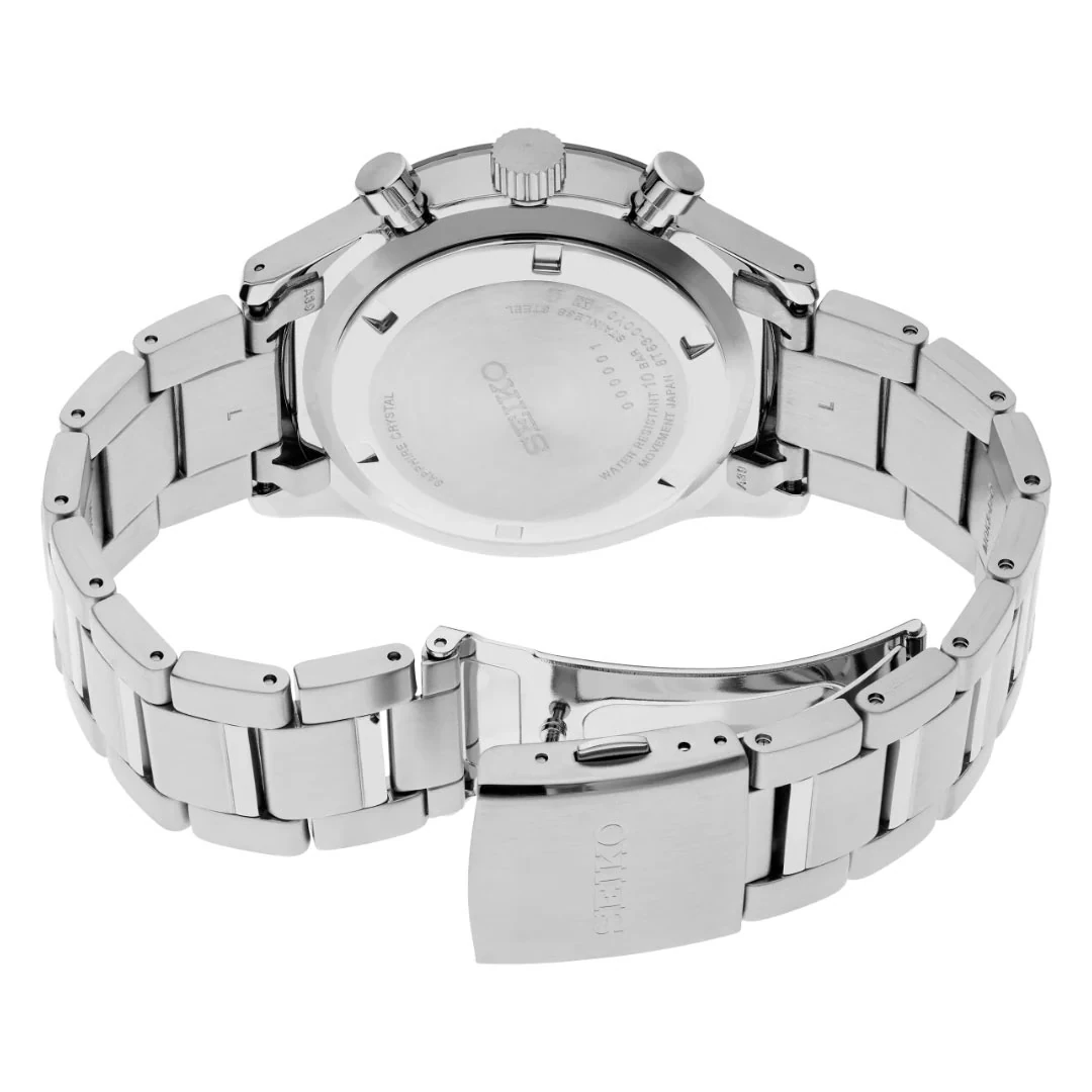 ساعت مچی مردانه Seiko SSB447P1 یکی از مدلهای برجسته برند ژاپنی سیکو است که در سری Conceptual Chronograph قرار دارد و ترکیبی از طراحی اسپرت، دقت بالا و دوام قابل اعتماد را ارائه میدهد. طراحی این مدل با الهام از داشبورد خودروهای مسابقهای صورت گرفته و به همین دلیل جلوهای مدرن و پویا دارد که هم جذابیت بصری و هم کاربردی بودن را در یک قاب فراهم میکند. بدنه ساعت از استیل ضدزنگ ساخته شده و با قطر 43 میلیمتر و ضخامت 11.6 میلیمتر، تناسب مناسبی برای اکثر مچها دارد. شیشه ساعت از کریستال یاقوت (Sapphire) مقاوم در برابر خش است که دوام و مقاومت بالایی در برابر ضربه و خراش ایجاد میکند.