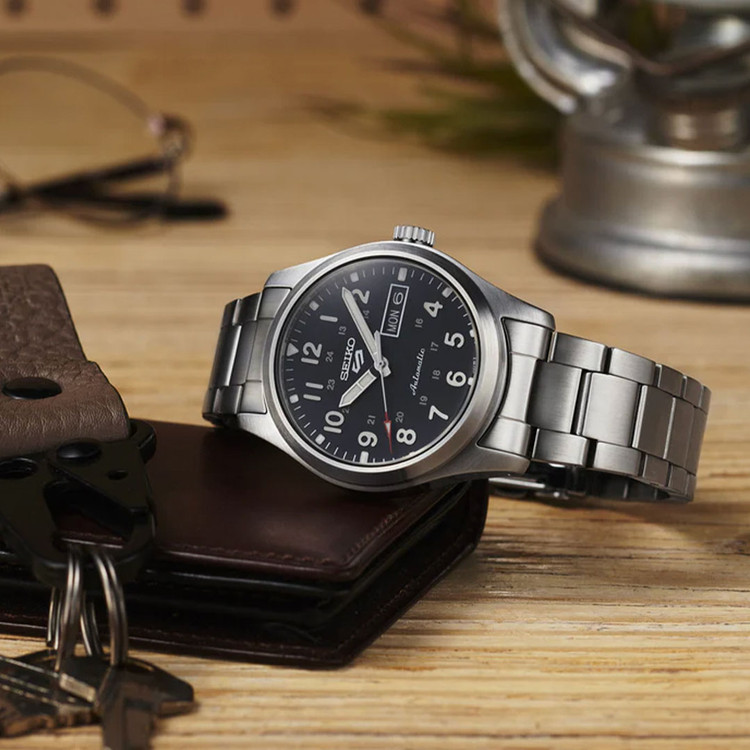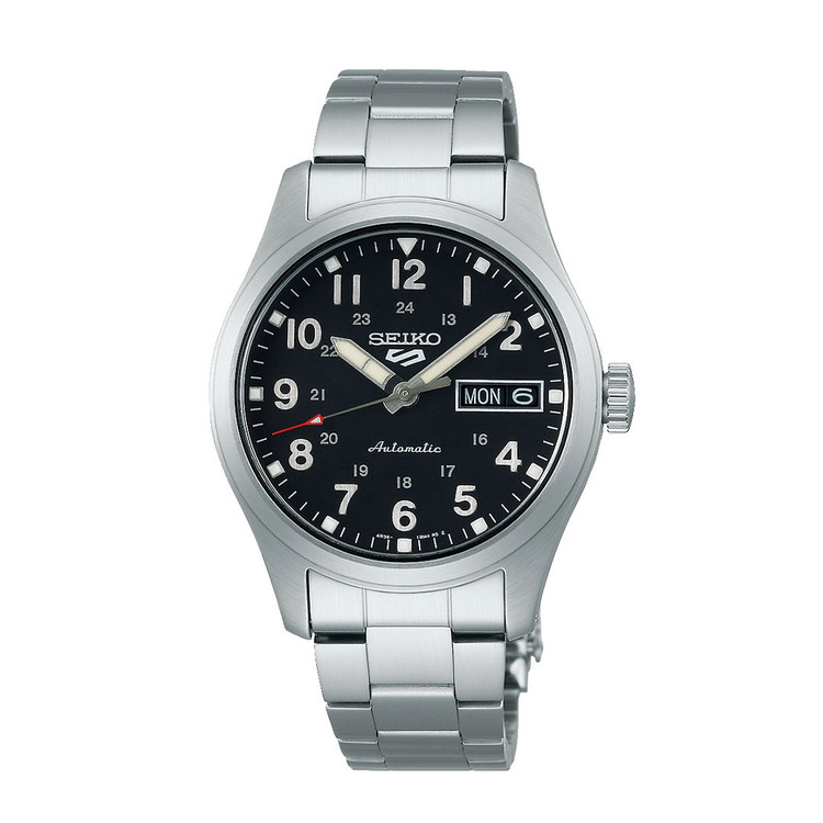 ساعت سیکو SRPJ81K1 از سری محبوب Seiko 5 Sports، نمونهای برجسته از تلفیق طراحی کلاسیک و ویژگیهای مدرن مکانیکی است. این مدل با ابعاد متوسط و طراحی مینیمال، مناسب استفاده روزمره و موقعیتهای نیمهرسمی محسوب میشود. صفحهی مشکی با اعداد عربی بزرگ و عقربههای نقرهای رنگ، خوانایی بالایی دارد و نوک عقربه ثانیه به رنگ قرمز، جلوهای خاص به ساعت بخشیده است.