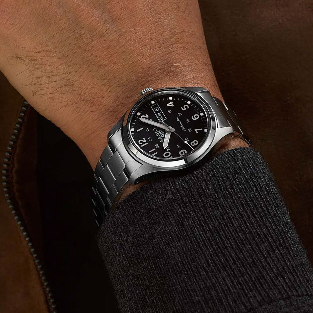 ساعت سیکو SRPJ81K1 از سری محبوب Seiko 5 Sports، نمونهای برجسته از تلفیق طراحی کلاسیک و ویژگیهای مدرن مکانیکی است. این مدل با ابعاد متوسط و طراحی مینیمال، مناسب استفاده روزمره و موقعیتهای نیمهرسمی محسوب میشود. صفحهی مشکی با اعداد عربی بزرگ و عقربههای نقرهای رنگ، خوانایی بالایی دارد و نوک عقربه ثانیه به رنگ قرمز، جلوهای خاص به ساعت بخشیده است.