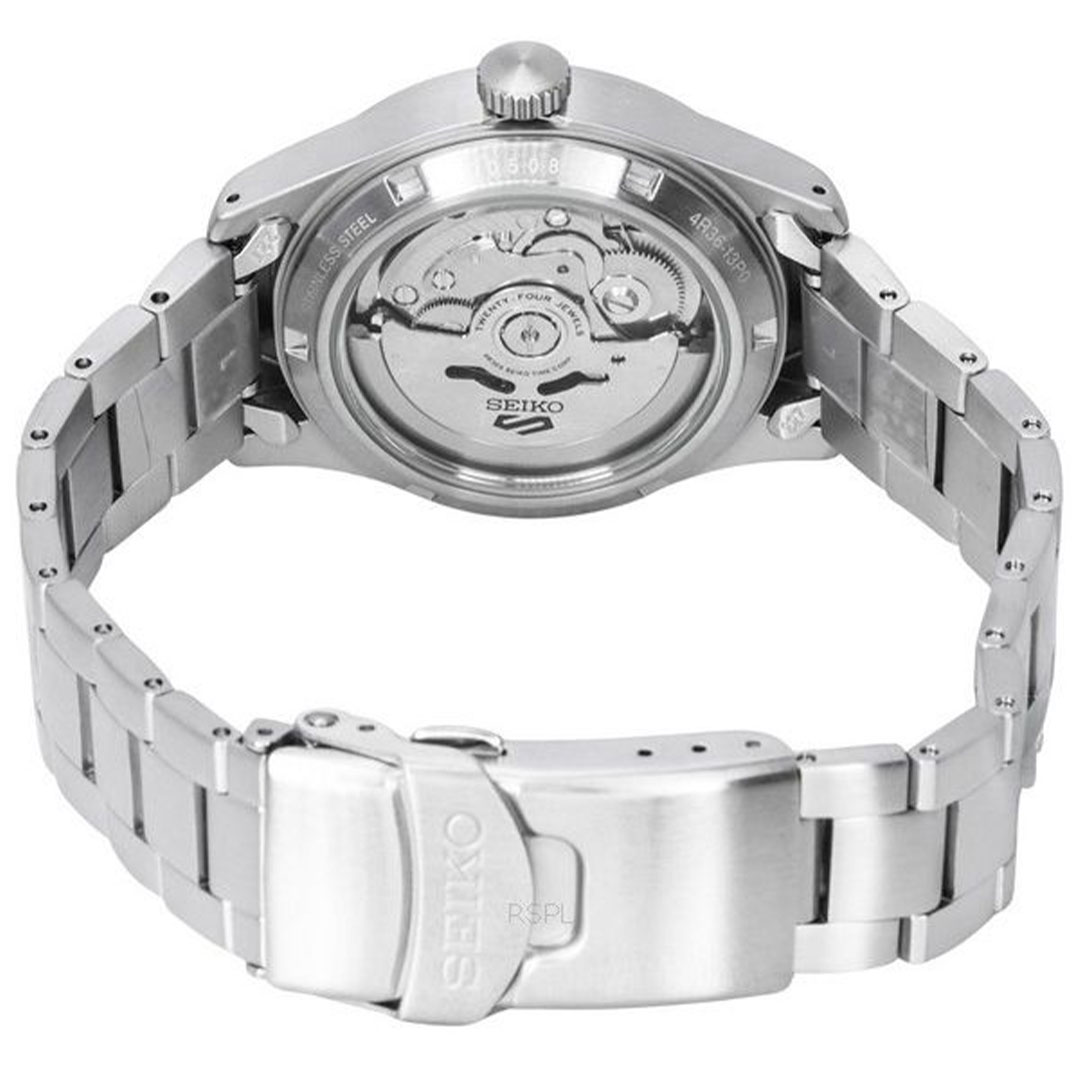 این ساعت به موتور اتوماتیک کالیبر 4R36 مجهز است که علاوه بر حرکت اتوماتیک، امکان کوک دستی و توقف عقربه ثانیه را نیز فراهم میکند. موتور شامل 24 سنگ جواهر است و توان ذخیره انرژی حدود 41 ساعت دارد، که دقت و دوام مناسبی برای استفاده روزمره ارائه میدهد. قاب پشت شفاف امکان مشاهده مکانیزم داخلی ساعت را فراهم میکند و حس مهندسی دقیق ژاپنی را منتقل میسازد.