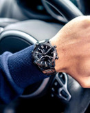 این ساعت با الهام از سیستم تعلیق خودروهای فرمول یک طراحی شده است. قاب آن از ترکیب کربن و استیل ضدزنگ ساخته شده که علاوه بر زیبایی، استحکام بالایی را ارائه میدهد. بند استیل با پوشش رنگی خاکی-مشکی، ظاهری اسپرت و در عین حال لوکس به ساعت بخشیده است. ابعاد بزرگ و طراحی خاص این ساعت، آن را به گزینهای جذاب برای علاقهمندان به دنیای موتور اسپورت تبدیل کرده است.