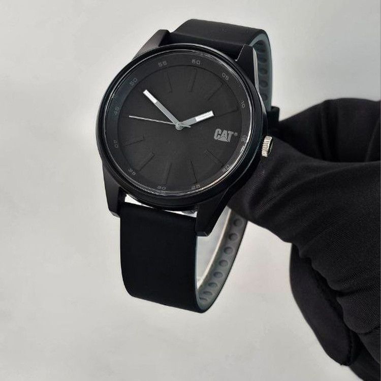 این مدل از سری Insignia برند CAT طراحی شده است و برای استفاده روزمره با استایل اسپرت-کژوال مناسب است. قطر قاب آن حدود ۴۳ میلیمتر است که روی مچ جلوهای برجسته دارد اما نه آنقدر بزرگ که برای مچ متوسط نامتناسب باشد. ضخامت قاب نزدیک به ۱۲ میلیمتر گزارش شده است، ضمن ایجاد حضور بصری، همچنان بدنهای کاملاً حجیم به حساب نمیآید. جنس قاب از پلیکربنات یا مواد ترکیبی سبک است که باعث شده وزن کلی ساعت حدود ۷۰ گرم باشد، بنابراین احساس سنگینی روی مچ به حداقل میرسد و استفاده طولانی مدت راحتتر است.