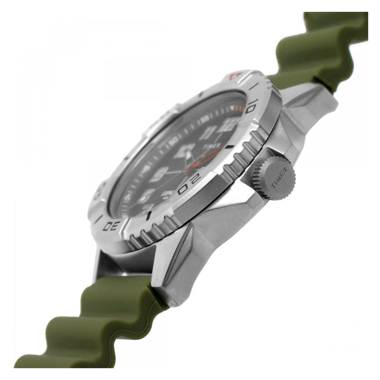 وجود نور پسزمینه INDIGLO که از ویژگیهای شاخص تایمکس است، این ساعت را در تاریکی بسیار قابلاتکا میکند و خوانایی را به حداکثر میرساند. همچنین شیشه مینرال کریستال مقاومت مناسبی در برابر خطوخشهای عادی ایجاد کرده و قاب فلزی برَس آن احساس استحکام و دوام را افزایش میدهد. بند سیلیکونی سبز رنگ نیز کاملاً سبک، انعطافپذیر و ضدتعریق است؛ بنابراین برای استفاده روزمره و فعالیتهای طولانیمدت هیچگونه ناراحتی ایجاد نمیکند.